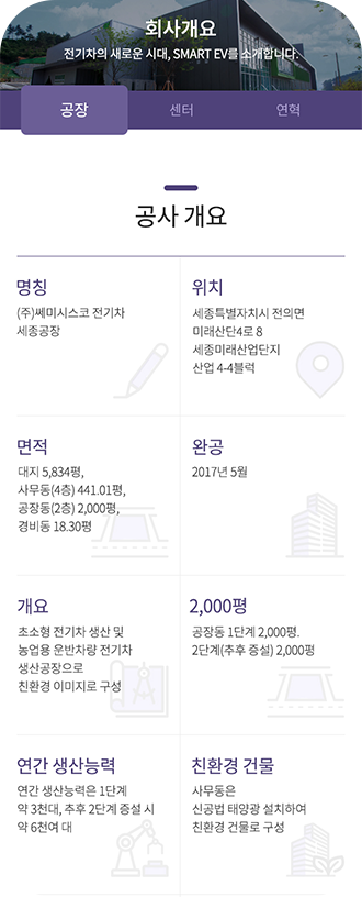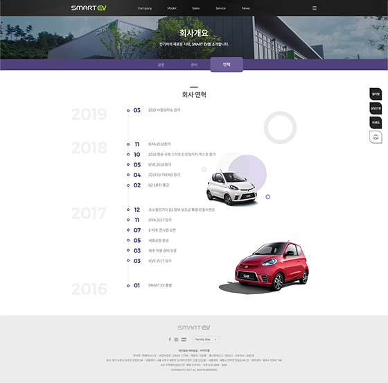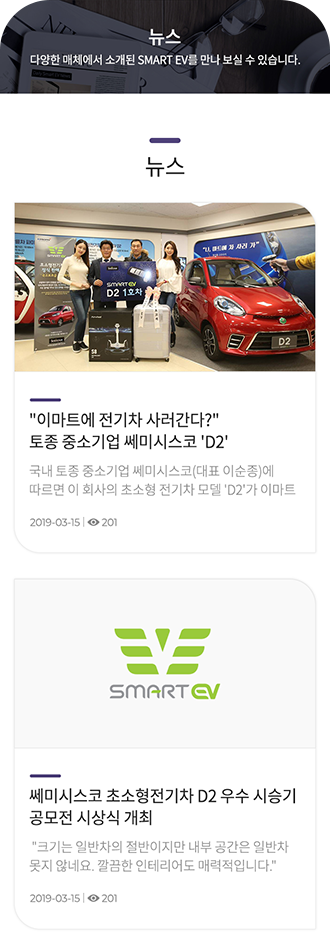 코스닥 상장법인 (주)쎄미시스코의 전기차 사업부인 SMART EV 초소형전기차 웹사이트를 리뉴얼하였습니다.